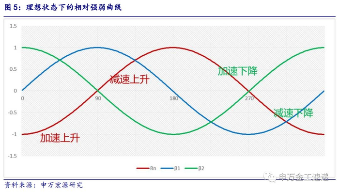以上方法对于我们划分的四类风格指数同样适用。以周期-非周期风格为例,我们假设理想情况下相对强弱曲线符合正弦波曲线形态,随着周期指数逐渐走强,其相对于非周期的相对强弱曲线开始加速上升,一定时间后市场预期得以体现,相对强弱曲线开始减速上升,直至达到临界点,开始下跌,市场转向非周期风格。