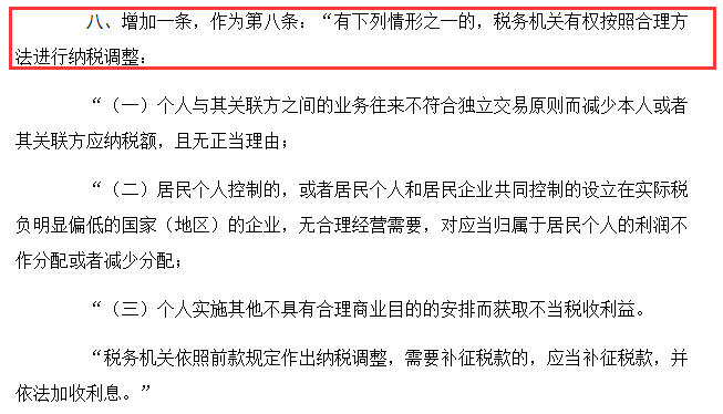 值得一提的是,近日,备受关注的修改后个人所得税法获全国人大常委会通过,将于明年1月1日实施,其中首次引入的反避税条款也意味着对高净值人群强化征管。根据中国人大网公布的修改后的个税法,新增了的反避税条款作为第八条: