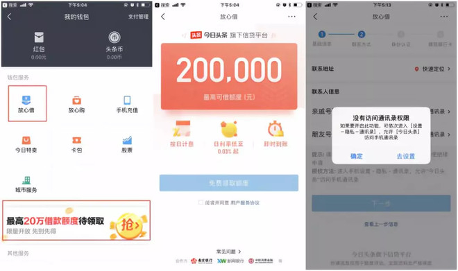 而在某些论坛当中,有用户发帖显示,早在6月16日已有部分用户的今日头条app中可见“放心借”入口。在百度经验中,3月30日即上线了今日头条“放心借”的操作指南。