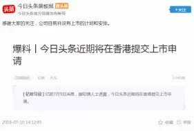 那一次,今日头条如去年一样通过官方账户紧急发布了辟谣。今日头条官方账户“今日头条黑板报”于7月10日否认了上市说法,称公司目前并没有上市的计划和安排。