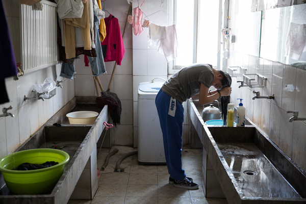 2017年4月23日,北京海淀区,北四环附近一个群租房,一名女租客在公共卫生间洗头。