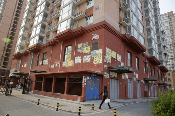 2016年4月4日,北京朝阳区十里河附近的一居民楼,租房启示被张贴在居民楼外立面上。