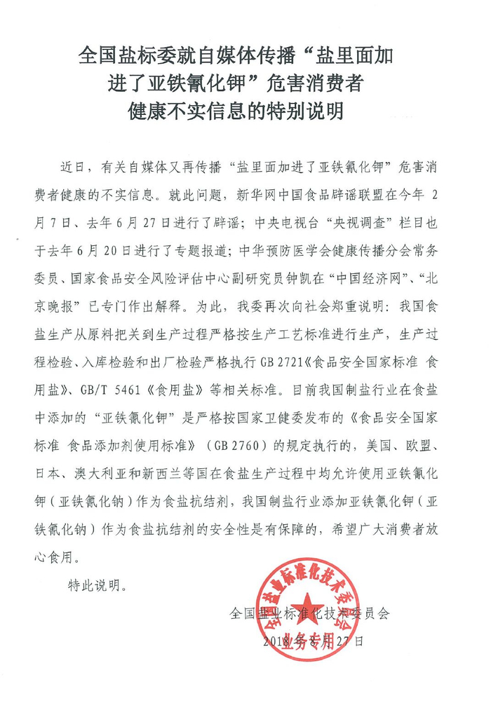 为此,8月27日,全国盐标委就自媒体传播“盐里面加进了亚铁氰化钾”危害消费者健康不实信息的特别说明,食盐中添加一定量的“亚铁氰化钾”作为抗凝剂是允许的、安全的,美国、欧盟、日本、澳大利亚和新西兰等国家亦允许该物质添加在食盐中。