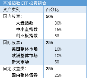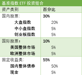 家庭成熟时期是儿女步入工作到长辈退休前时期,这个时期一般家庭经济水平达到最高峰,因为儿女开始经济独立,抚养费用已经大大减少,父母开始制定养老计划,这个时候一般人们的风险承受能力大大下降,更倾向于取得稳健的收益,获利目标较定期存款高3%~5%,因此这个时候建议配置的ETF产品是: