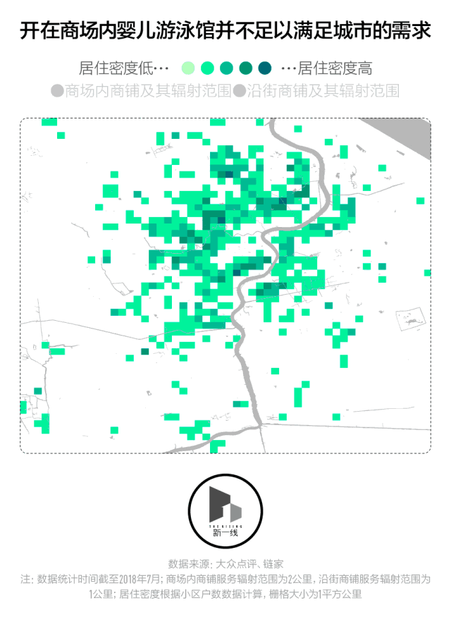 代入上海的居住空间数据就能从上图中看到,上海全部704家婴童水育馆能够覆盖69.9%的居住人口,而其中开设在商场内的婴童水育馆辐射服务范围仅能覆盖13.5%的居民,更多居住区都依靠渗透在街巷、步行可达的婴童水育馆来服务。即使在综合商场林立的上海,仅靠商场内的亲子设施依然无法满足城市居民的需求。