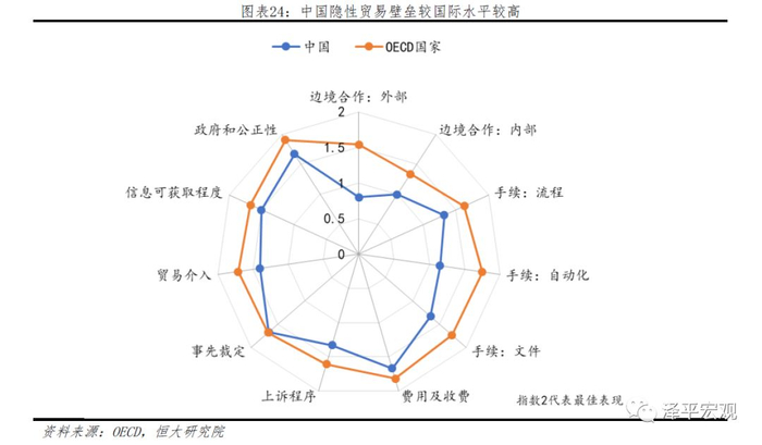 整体看,我国隐性贸易壁垒仍受对外资准入限制、竞争障碍、监管透明性及其他因素的影响而低于国际水平。从OECD发布的隐性贸易壁垒指数来看,2017年中国在信息可获取程度、贸易介入、上诉程序、边境合作以及手续等方面仍大幅落后于OECD国家。