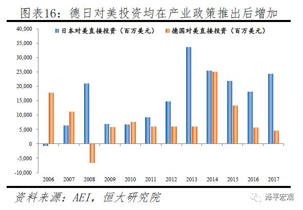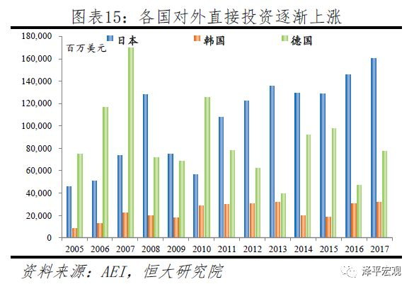 各国对外投资在宣布高科技产业政策后均呈上升趋势。伴随高科技产业政策的全面铺开,其他各国对美投资总体呈现上升趋势,其中自2016年提出《第五期科学技术基本计划》以来,2017年日本以合并、并购为主的对美国直接投资同比增长34.4%。德国2013年提出“工业4.0”战略后,2014年对美直接投资同样快速增长,同比增幅达319%。事实上,伴随次贷危机后世界经济逐步恢复,在各国推出类似高科技产业政策后,各经济体对外直接投资均有明显上升。美国无视经济发展规律、选择性忽略他国实际数据证据,表明了这些指责实际上是打着贸易保护主义旗号的遏制,有失公允。