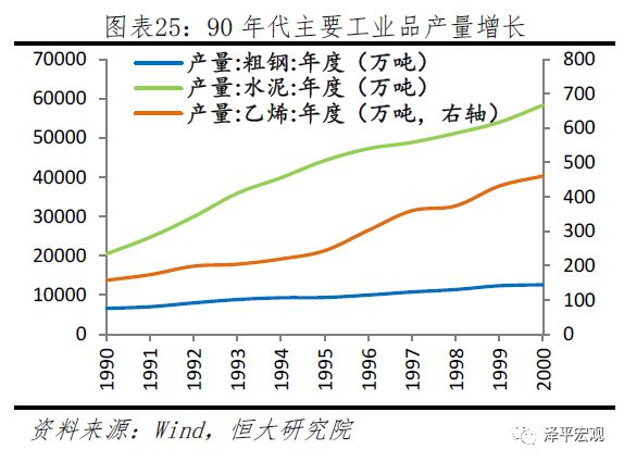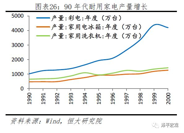 应该说,这些政策起到了一定作用,我国的工业基础逐渐夯实,为经济的进一步发展提供了较好的基础。90年代中国的主要工业品的产量均出现了明显增长,例如水泥的年产量从1990年的2亿吨增长至2000年的5.8亿吨;主要耐用消费品的产量也明显增长。例如,彩电的年产量从1990年的1000万台增长至2000年的4200万台。