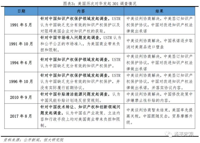 对中国而言,从历史上来看,美国自1991年以来至今共对中国发起6次301调查,其中大部分调查都源自对中国知识产权问题的质疑,属于特别301调查,而前5次调查最终均以中美协商后,中国先后修订相关知识产权保护法律、扩大市场准入等方式得以解决。而本次在美国贸易保护主义、极权主义抬头的思想下发起的新一轮301调查,并引发中美贸易摩擦的步步升级,源于巨额贸易逆差及其结构性体制性问题和分歧,本质在于新冷战思维霸权国家对新兴崛起大国的遏制。