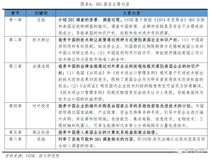 美方301报告分六章对中国展开五项指控,包括不公平的技术转让制度、歧视性许可限制、政府指使企业境外投资获取美国知识产权和先进技术、未经授权侵入美国商业计算机网络及其他可能与技术转让和知识产权领域相关的内容,为发起贸易战提供依据。1)不公平的技术转让制度,一是认为中国政府利用所有权限制,如合资企业、外国股权比例限制等方式强制美国公司向中国公司转让技术;二是认为中国政府利用行政许可、审批程序强迫美国公司以技术转让作为获取市场准入的条件。2)歧视性的许可注册限制,美方指责我国《技术进出口管理条例》与《合同法》中关于技术改进的所有权和赔偿责任归属的规定偏袒国内企业,对外资企业设置歧视性限制。3)对外投资,认为中国政府通过国家战略、产业政策、资金支持等多种手段,引导中资企业海外并购,并通过高科技领域的并购不正当地获取美国企业先进技术。4)指责中国未经授权侵入美国计算机系统,盗取商业秘密。5)其他可能和301调查相关的中国法律、政策和实践,但美国承认不确定这些内容是否应纳入301调查。