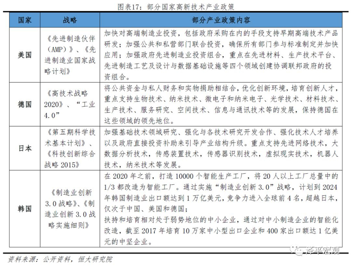 事实上,包括美国在内的各主要经济体近年来均在高科技领域制定相似产业政策。进入21世纪以来,伴随经济水平的不断提高以及计算机技术的进步,以大数据、云计算为依托的各类高端制造、智能科技产业逐步兴起,美德日韩等国为在新一轮工业革命中抢占先机,均纷纷出台相关产业政策鼓励、引导企业在高科技领域的投资。从发布的高科技制造业战略以及政策来看,各国指导性纲领中提及的战略目标以及实施方式相似度很高。2012年美国提出《先进制造业国家战略计划》,强调加快对中小企业高端制造业投资,并通过政府采购以及直接投资、支持基础技术研发、提高政产学研用模式效率、培育高科技术人才等手段支持高端制造业的发展。该计划内容与《中国制造2025》、韩国《制造业创新3.0战略》、日本《第五期科学技术基本计划》以及德国《高技术战略2020》主体内容以及实现的方法手段极为相似。