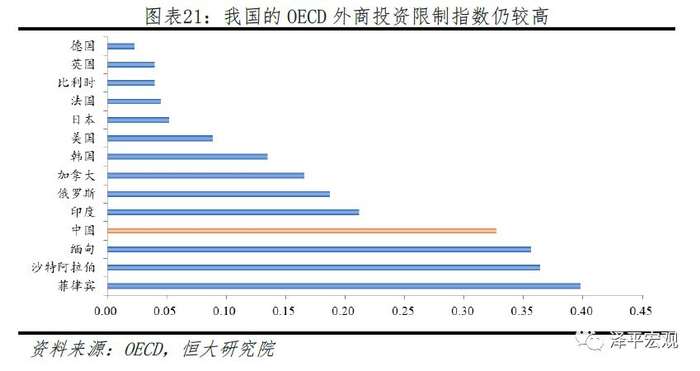 OECD于2017年发布的最新外商投资限制指数显示,我国在68个主要经济体中,外商限制指数排名第四(限制程度由高到低),整体限制程度仅仅低于菲律宾、沙特阿拉伯和印度尼西亚。从分项来看,我们在电力、航空运输、电信服务和金融等领域限制程度较高。今年我国大幅放开金融领域的限制,预计我国在相应领域的得分将有所提升,但其他领域的问题仍然不容忽视。