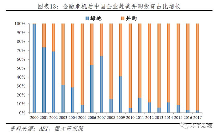 绿地投资有极强的顺周期性,投资数量的多少与东道国的整体经济情况有关。当东道国经济形势较好时,投资机会较多,绿地投资的占比较高,反之则较低。金融危机之后,美国国内绿地投资机会较金融危机前明显减少,而一些当地企业则因为债务压力等主动寻求兼并重组,导致中国对美绿地投资占比下滑,而并购投资的占比上升。因此,近年来绿地投资占比的下滑,反映的是美国国内绿地投资机会的下降,以及中国企业在海外投资过程中主要依据经济条件决策,而非政府主导。