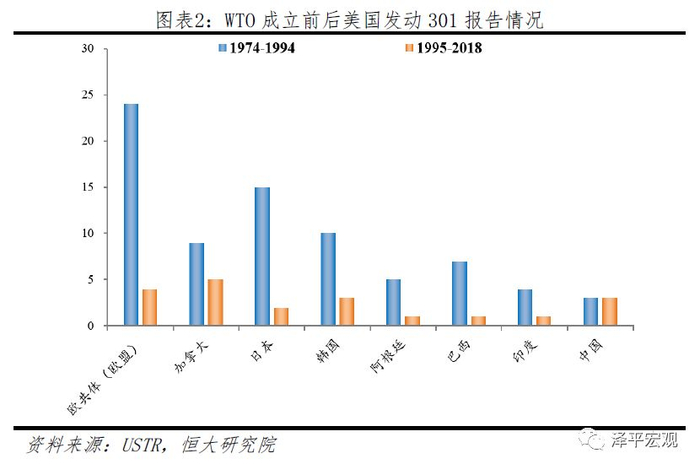 从发动301调查的频率来看可分为两个阶段,以WTO成立为分界点,美国在此前曾大规模动用301调查企图减少美国贸易赤字,而在1995年WTO正式成立后,国际贸易争端逐步转移到WTO机制上,美国发动301调查的频率大幅下降。