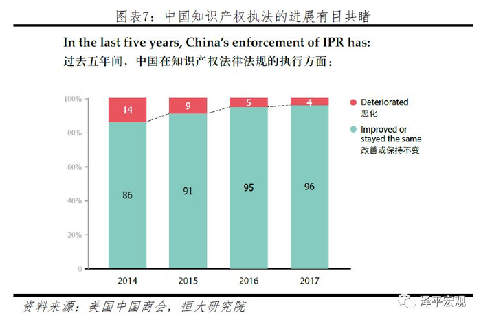 美国中国商会每年都会开展问卷调查并公布调查报告,但USTR却在2018年的301报告中引用5年前的数据,存在明显的选择性引用。美国中国商会近五年来的调查结果清晰地表明中国在知识产权保护领域所取得的进步。2018年的报告显示,96%的受访企业认为,过去五年,中国在知识产权保护执法方面改善或保持稳定。仅有8%的企业认为商业伙伴的技术转移安排是知识产权保护方面最严重的问题。此外,75%的受访企业认为在中国和商业伙伴和客户分享的技术和专利数量较祖国之外的其他海外司法管辖区更少或持平。