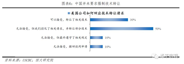 一是这份调查没有注明发放问卷的数量和回收问卷的数量。调查报告声称这份报告的数据来自USCBC的会员企业,但没有标注接受本次问卷调查的企业的具体信息。我们仅从USCBC的官网上了解到该委员会的注册会员共200家,调查的可信度存疑。二是数据引用存在误导性和选择性。首先19%并不是一个特别高的比例,其次,USCBC非常明确地表明,技术转让的要求中67%来自合作企业,33%来自中央政府,25%来自地方政府,合作企业才是技术转让的主要需求方,在实际谈判中并非被强制,而是平等协商,USCBC调查报告显示80%的美方企业认为中方企业的技术转让需求可以接受或在降低请求后可以接受,但301报告却刻意忽略这一事实,试图证明中国政府在技术转让过程中占据重要作用,这显然具有严重误导性。
