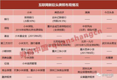 在上述涉足金融业务的互联网公司中,小米的持有的各类金融牌照相对最全。