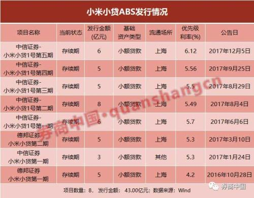 可以看到,除借款之外,成本相对较低的资产支持证券化,是近年来小米金融在内的从事消费信贷业务各类机构的重要融资渠道。截至目前,wind数据显示,小米小贷以小额贷款作为基础资产,发行了8只总计43亿元的ABS项目。不过,融资成本逐步攀升,到了去年12月最新一期的优先级利率水平已经达到了6.12%。而且,受到监管、利率水平等多因素影响,2017年底到今年5月份,消费金融ABS的发行速度已经明显放缓。