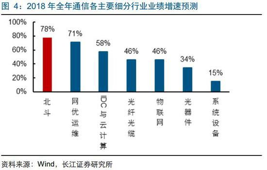 从整个通信板块细分行业横向对比来看,北斗板块上半年业绩增速和全年业绩增速预测均领先于通信板块其他细分行业。2018 年上半年北斗板块归母净利润同比增长 71.94%。而从Wind全年一致预期业绩来看,北斗板块业绩增速也达到了78%,居各主要细分行业业绩增速之首,体现出北斗板块出色的增长态势。