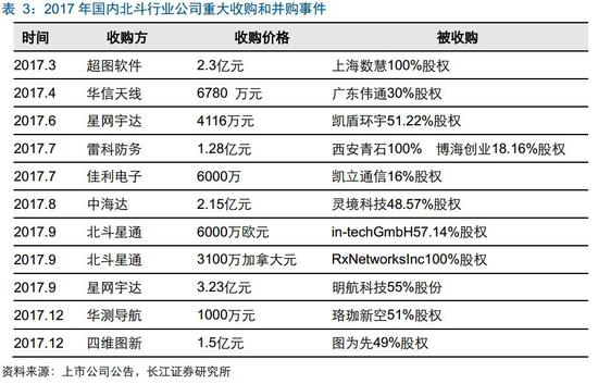 对应国内来看,2017年国内北斗行业公司积极开展海内外并购合作,通过收购相关企业,积极推动产业链关键环节融合与完善,拓宽业务收入来源实现跨界发展,着力于推动北斗高精度实现多产业多领域的渗透发展。随着北斗高精度在更多行业实现融合应用,北斗高精度市场空间也将进一步扩大。