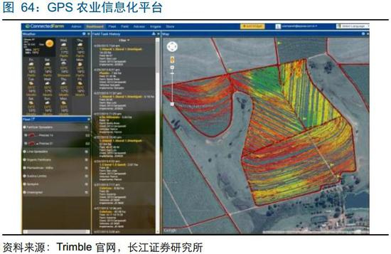 美国早在1990年就将GPS应用到农业生产领域,通过GPS信号完成对农机的线路规划,实现农机的自动驾驶,在节约了人力成本的同时也提升了农业生产效率。GPS信号还可事先将土地信息化生产地图,自动计算出每一块小区的施肥配比和喷施量,并想农机和自动灌溉机下达配比指令,试验数据表明用GPS指导施肥的作物产量比传统平衡施肥作物产量提高30%左右。美国GPS巨头天宝精准农业分部在2017年贡献营收4.77亿美元,占总营收的18%。Trimble主要提供产品包括农场导航设备、定位系统和农机自动化应用系统和信息管理方案。通过使用大数据、物联网等技术实现优化农业生产投入,提高农产品产量和环境质量。