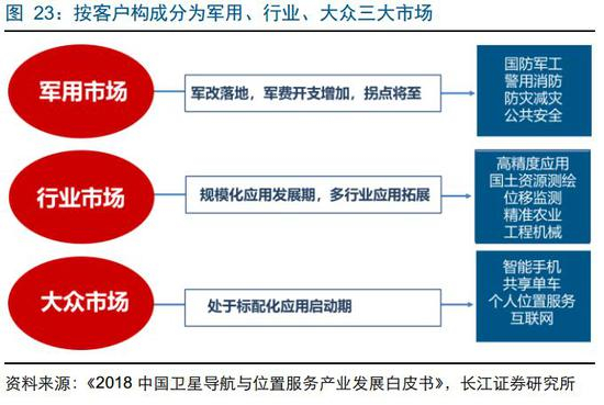 从市场来看,卫星导航可以按照客户构成分为军用市场、行业应用市场和大众市场三大市场,其中军用市场行业市场以军用、警用和安防等领域应用为代表,市场未来增长主要来自北斗装备普及和替换,行业应用市场主要是对高精度定位等有需求的行业厂商,正处于规模化应用发展期;大众市场以车载导航和手机定位等为代表,随着物联网、车联网、可穿戴设备等新兴应用发展,大众市场将具备巨大的成长空间。