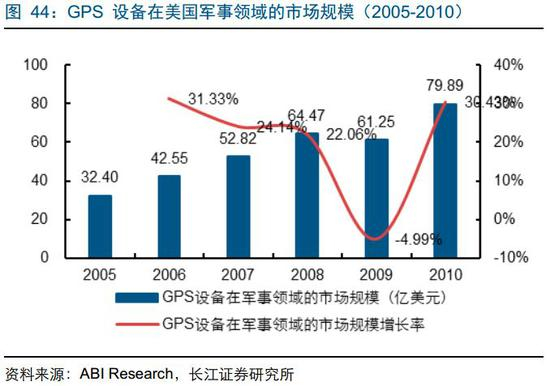美军对GPS卫星导航系统在军事领域中的战略地位非常看重,美国《军事评论》杂志曾明确指出:“谁能掌握卫星导航优势,谁就掌握了战争主动权。”美军在GPS刚刚建成之初便用于军队装备部署,在GPS装备持续的渗透和替换的同时,GPS设备在美国军事装备市场规模仍然保持高速增长,据ABI Research在2011年的调查数据来看,2005-2010年,GPS设备在北美军事领域市场规模由32.40亿美元增长到79.89亿美元,年均复合增长率接近20%,持续保持高速增长;GPS装备的性能和单价也在不断提升,2005-2010年北美军事领域GPS设备平均单价由1212美元增长到1704美元,增长约41%。美国军方市场在上世纪开启军用化之后的10余年内仍然保持高增长,可见军用市场对卫星导航定位的需求空间广阔。