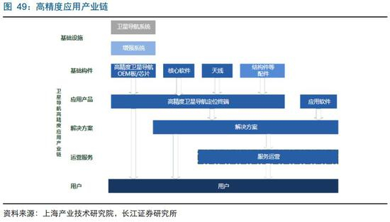 从北斗导航系统整体架构来看,分为卫星段、地面段和用户端三大部分,从对应产业链结构来看,总共分为上游基础元器件、中游终端和系统集成、及下游运营服务三大环节。