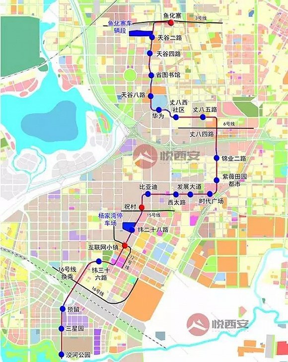 西安高新云轨示范线规划线路全长约27.5km,北起地铁3号线鱼化寨站,南至洨河公园,共设置车站25座,一座车辆段和一座停车场,分别为鱼化寨车辆段和杨家湾停车场,远期线路规划延伸至秦岭。