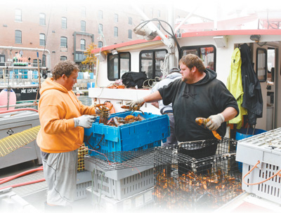 美国单方面挑起贸易争端后,出口中国的龙虾受到影响。图为2017年11月,缅因州渔民从船上卸下龙虾。