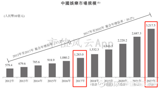 中国娱乐市场的规模于2017年达到人民币1.28万亿元,已成为世界第二大市场,仅次于美国。根据艾瑞咨询报告,中国的娱乐市场将持续增长,并于2022年增至人民币3.21万亿元,相当于自2017年起按复合年增长率20.2%增长,远超该行业的全球增长。