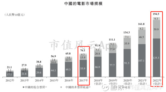 中国电影市场规模已位居世界第二,仅次于美国。根据艾瑞咨询报告,中国电影市场 2012年至2017年的复合年增长率为29.2%,2017年的市场规模达到人民币761亿元,且预计以20.7%的复合年增长率进一步增长,并将于2022年达到人民币1,945亿元。按票房计,预期中国将于2019年超越美国成为最大的电影市场。