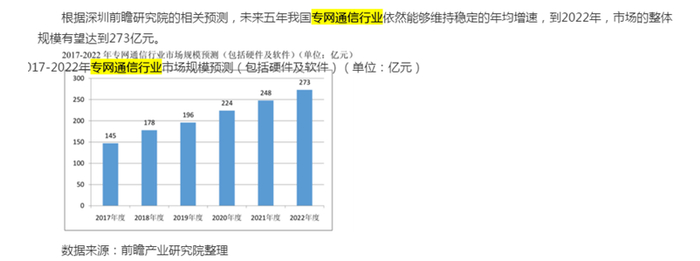 参考第三方数据,可能表明这一预期偏离实际。几天前,另一家上市公司新宏泰,为收购一家新三板专网通信行业标的海高通信,公布了来自深圳前瞻研究院的数据。