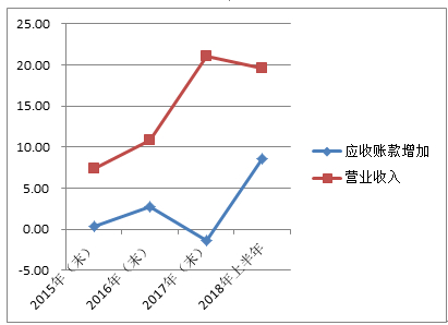 再继续看另一时段,2017年末至2018年年中的情况。2018年上半年,北讯集团应收账款又突然暴增。这一期间,公司实现19.6亿营收, 应收账款则从期末8.7亿元,暴增至17.3亿元,增加额达8.6亿元,居然近一半营收来自应收账款。这种表现一反上个半年的会计年度,收入增长而应收稍降的情况。