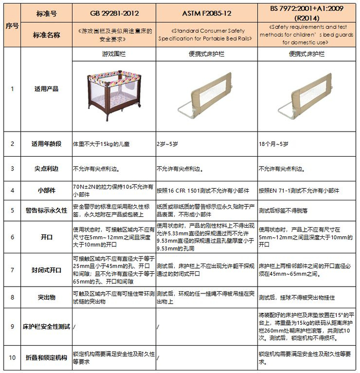 在国内,床护栏还属于一个比较新兴的育儿产品,目前还没有针对性的标准。我国2014年5月1日实施的GB 29281-2012《游戏围栏及类似用途童床的安全要求》是我国涉及到护栏的相关标准。尽管名称相似,但该标准中规范的“游戏围栏”的定义与实际不同。