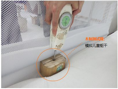 ▲木质测试规:模拟儿童躯干儿童身体可能从间隙中滑出,头部卡在间隙之间,造成窒息。