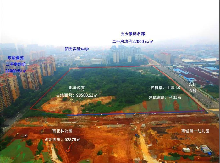 地块四至:西则为东骏豪苑,东则为旧工厂,北侧为南城阳光实验中学,光大景湖名郡,南侧为在建的百花林公园,南城第一幼儿园,南城中心小学分校雅园校区。
