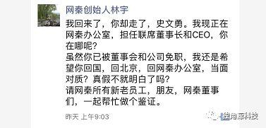“我回来了,你却走了,史文勇。”9月11日,林宇再次公开发布微博质问史文勇,“我现正在网秦办公室,担任联席董事长和CEO,你在哪呢?虽然你已被董事会和公司免职,我还是希望你能回国,回北京,回网秦办公室,当面对质?真假不就明白了吗?”