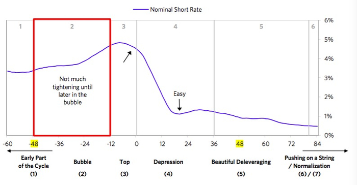 达利欧提及,大型债务危机都可以分为六个阶段:周期早期、泡沫阶段、触顶、萧条、去杠杆以及正常化。