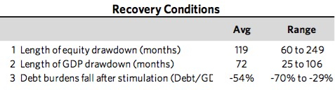 达利欧认为,即使是在一个很平稳的去杠杆进程中,一般需要大约十年才能使实体经济活动达到此前的峰值。根据桥水对于46个案例的研究,平均需要9年才能使经济回到此前的峰值。而股价如果要回归到过去高点,可能需要花更长的时间,因为投资者持有更多股票的前提就是要具备承担风险的意愿。