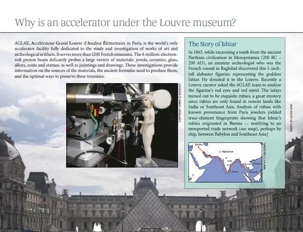爱神维纳斯雕像、胜利女神像、达芬奇的蒙娜丽莎画等卢浮宫博物馆中最珍贵的藏品都向参观者展示。而就在那新建的玻璃金字塔下深15米处的地下,却有一样东西是卢浮宫博物馆馆长绝不对参观者展示的,那是一台名为AGLAE的粒子加速器。
