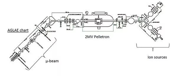 AGLAE的加速器采用的是NEC公司建造的串列式静电加速器(型号6SDH2),总长度约27米,配备了两个离子源,一个用于产生质子和氘,另一个用于产生氦离子。该加速器建有两条实验束线,一条通向真空室,而另一条称为外光束线,无需任何取样,不受真空室尺寸的限制,可直接分析任何大小和形状的艺术品。离子被AGLAE加速至每秒20000~30000千米的速度后轰击被检物,随后被检物发射出不同的辐射,这些辐射由后端的探测器捕获,数种技术相结合,对被检物表层所含的微量化学元素进行识别。由于配置了聚焦系统,到达被检物的粒子束流直径只有20微米左右(仅相当于半根头发丝的粗细),对被检物没有破坏性。