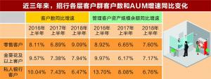在招行的客户层概念里,零售客户指的是全部个人用户,含借记卡和信用卡的客户;金葵花及以上客户指在招行月日均总资产在50万元及以上的零售客户;私人银行客户指在本公司月日均总资产在1000万元及以上的零售客户。证券时报记者调查招行近三年的半年报同期(2016H、2017H、2018H)数据发现,不管是户数增长还是管理客户资产规模余额(AUM)增长情况,招行的普通零售客户增速均为三年来首度超过中高端客群增速。