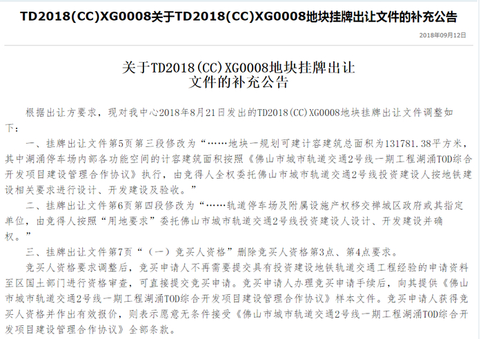 9月12日,佛山市公共资源网发布湖涌TOD地块的补充公告,重点降低了竞买人的资格,不再需要具有投资建设地铁轨道交通工程经验资质,更改为须引进至少1家具有地铁投资建设经验的企业,联合开发本宗地等事项。