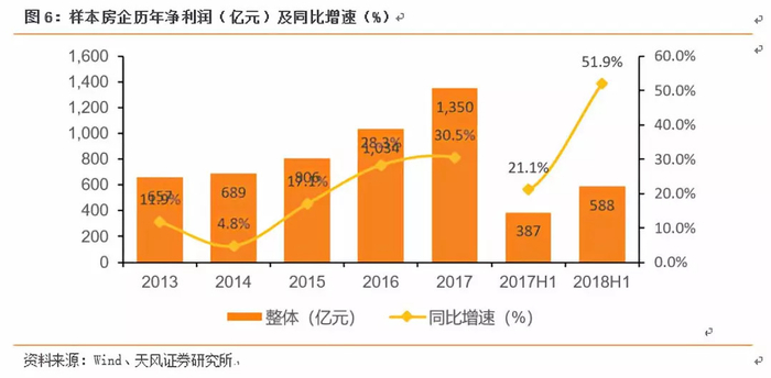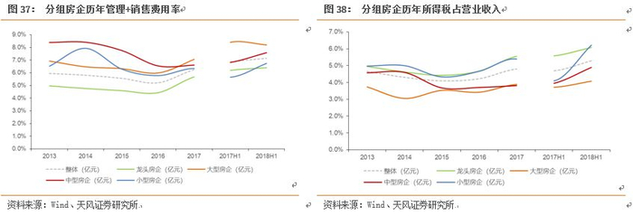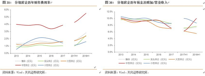 大型房企业绩增长速度在四组房企中是最快的,2018年上半年其营业收入和净利润的增速分别达到48.7%和85.4%。但其毛利率和净利率在四组房企中也是最低的,分别只有29.4%和11%。其销售管理费用率在四组房企中是最高的,达到8.2%,这可能部分因为大型房企销售规模处于快速扩张期,因而费用随销售规模的扩张迅速膨胀,并且直接进入当期损益;但是营业收入的结算存在滞后性,当期结算的营业收入规模小于当期实现的销售规模,费用率的分子分母不匹配,导致费用率显得较高。