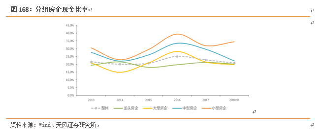 从货币资金对短期有息债务的覆盖倍数来看,截至2018年上半年末龙头房企和小型房企较为安全,均超过了一倍,分别为2.51倍和1.92倍;大型房企和中型房企则只有0.83倍、0.95倍。小型房企货币资金对短期有息债务的覆盖率较高可能反应出在行业集中度提升的背景下,他们主动去杠杆,减小了拿地的力度。