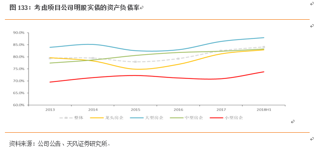 我们发现明股实债在房企融资结构中的占比近年来有小幅提高的趋势,但总体占比不大,2018年半年报44家样本房企明股实债占剔除预收款的总负债的比例不超过5%,仅仅是一种补充的融资方式。分组来看,大型房企明股实债融资占比(7.3%)明显高于其他几组房企,可能是因为大型房企作为追赶者,为了追求规模的快速扩张,较多地进行了前端融资,因而明股实债的融资方式使用得更多。