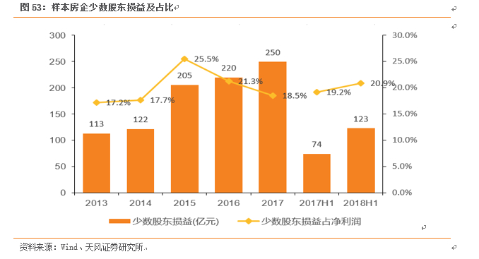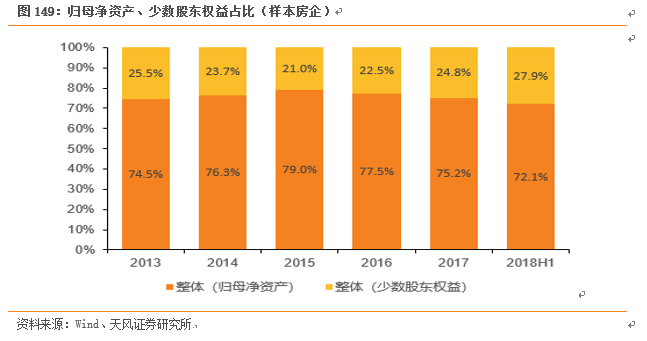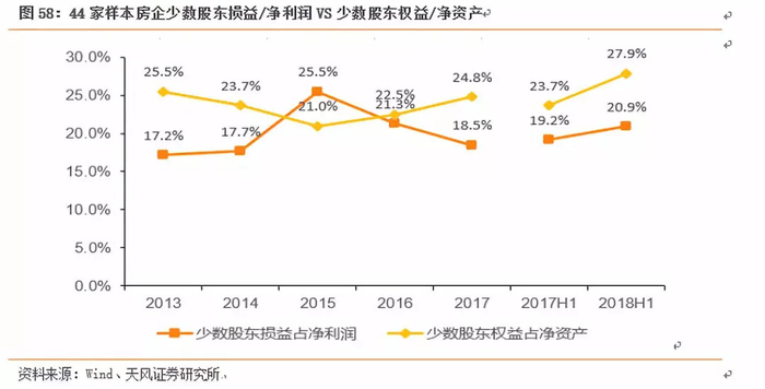 我们发现近两年少数股东权益占净资产的比例持续大于少数股东损益占净利润的比例,且两者差距有小幅扩大的趋势。2018年半年报44家样本房企少数股东权益占净资产的比例达到27.9%,而少数股东损益占净利润的比例则只有20.9%,两者差距7个百分点。这可能是近两年房企更多采用了明股实债形式进行融资的结果。
