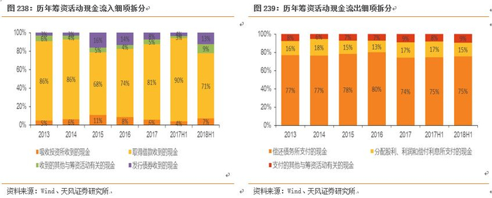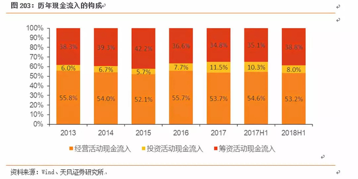 如果拆分细项来看的话,销售回款和借贷是现金流入最主要的两大来源。2018年上半年“销售商品提供劳务收到的现金”占比达到43%;“取得借款收到的现金”占比达27%,两者合计占比达到70%。此外“收回投资收到的现金”和“发行债券收到的现金”占比也分别达到了3%和5%。