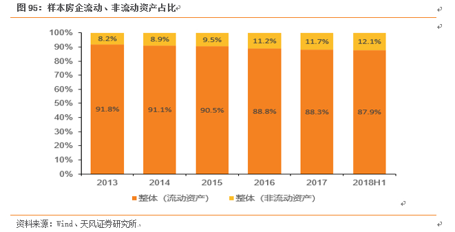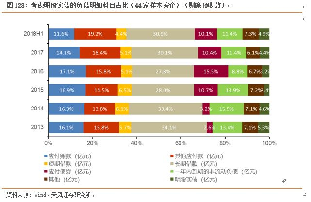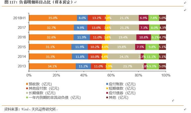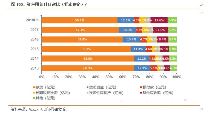 如果拆分44家样本房企资产的详细结构,我们发现存货占比超过一半,但近年来占比不断下滑,2018年上半年占比降至56.1%;长期股权投资和其他应收款占比不断提高,分别达到4.5%和12.6%,这可能是因为合作开发项目不断增多所致,房地产企业持有的非并表项目公司的所有者权益反映在长期股权投资科目里,而对非并表项目公司发放的股东借款体现在其他应收款科目里。此外,与合作方共同开发项目的过程中,项目形成销售回笼后各股东方可能会按持股比例将富余资金拆回。对于合并报表的一方而言,少数股东提前拆回的资金也记入了其他应收款,部分房企会在附注中将其列示为“应收少数股东款”。
